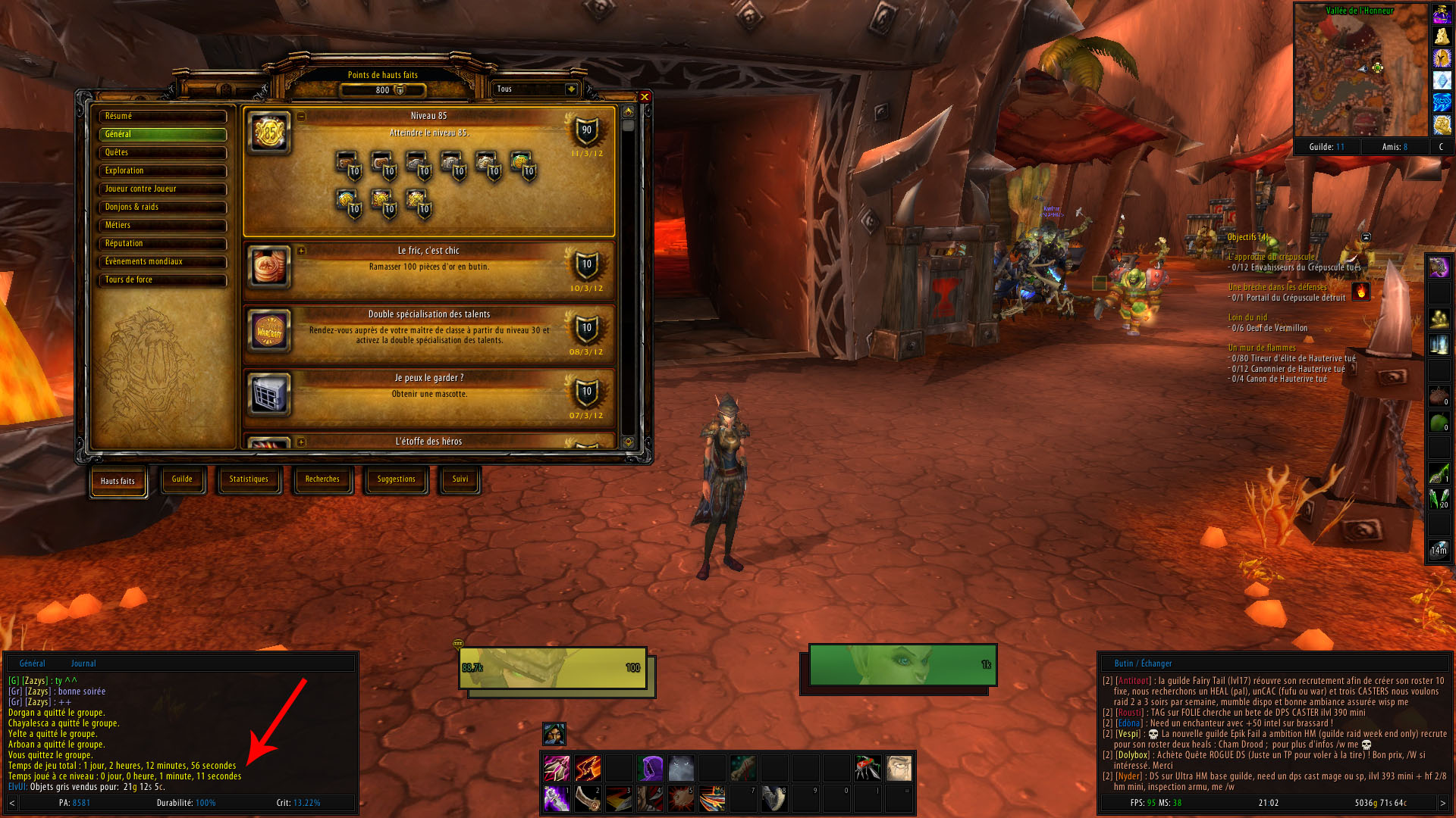 Je me suis lancé comme défi vendredi soir de passer 85 avant dimanche soir. En bref, j’ai passé le Week-End sur WoW. J’ai profité de l’offre de résurrection de personnage dont vous pouvez voir la méthode de fonctionnement ici. Seul regret, je n’ai pas réussi à passer sous la barre des 1 jours de /played comme MamyTwink le disait dans son article. Il s’en est fallu de peu mais on ne chasse pas les vieux démons d’un farmeur d’HV qui à tendance à camper Orgrimmar.