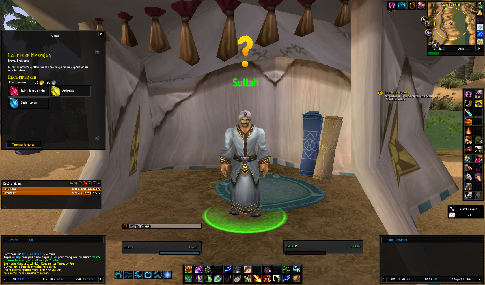 Une fois la quête acceptée, vous devez vous rendre auprès de Sullah, qui vous donnera en échange 1 Rubis de feu d’enfer, 1 Ambréine, et 1 Saphir Océan.