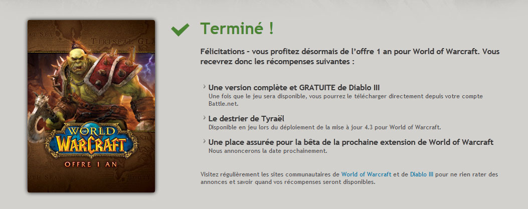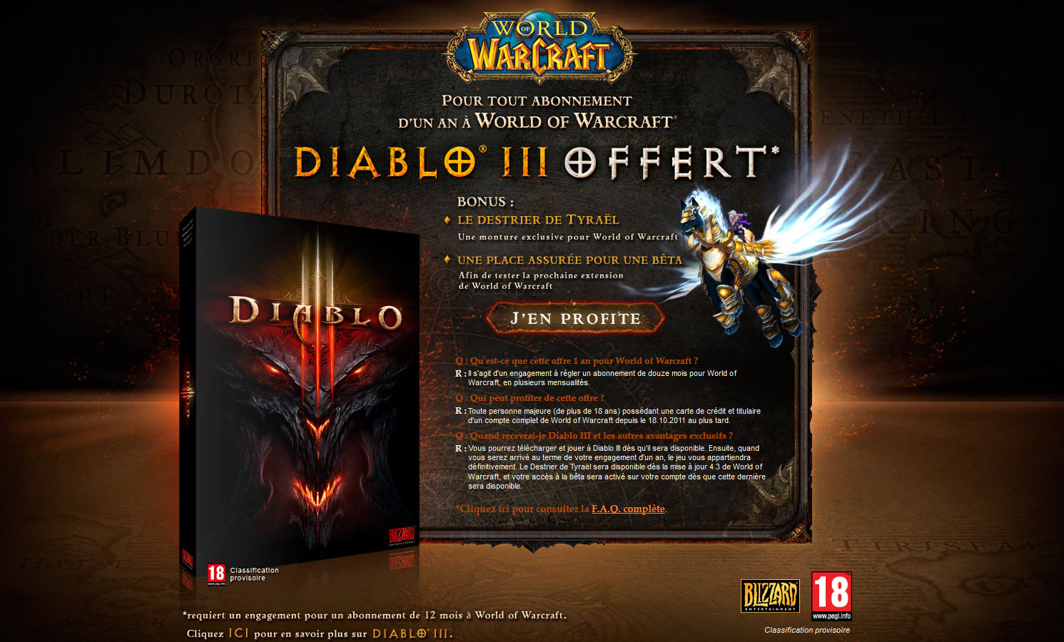 dit :[…] nombreux joueurs se voient refuser l’offre de Blizzard qui consiste à s’engager 12 mois à WoW et à recevoir un exemplaire gratuit de DiabloIII. D’après les premières constatations, […]