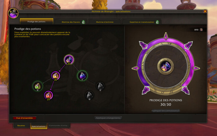 Pour la sous-spécialisation, c’est à votre convenance entre Voie de la Lumière et Voie du Vide. De mon côté, je privilégie les potions avec des statistiques brutes, que je trouve plus simples à vendre.