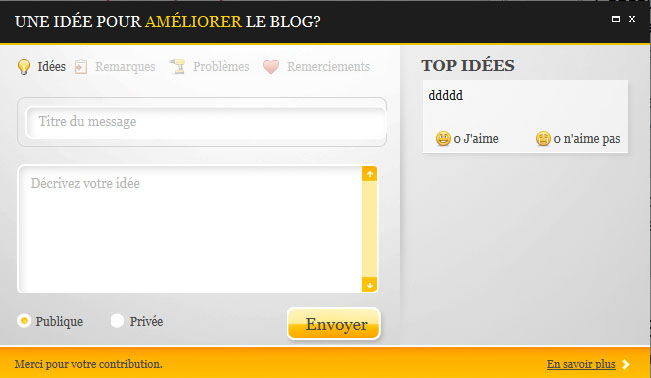Comme vous le savez, je souhaite que le blog colle le plus avec vos souhaits, c’est pourquoi j’ai mis en place un système de Feedback. À travers celui-ci vous pourrez reporter vos suggestions, vos remarques, vos problèmes ou encore laisser vos commentaires. Ce système est ouvert à tous, n’hésitez donc pas à l’utiliser, il se trouve à votre droite.