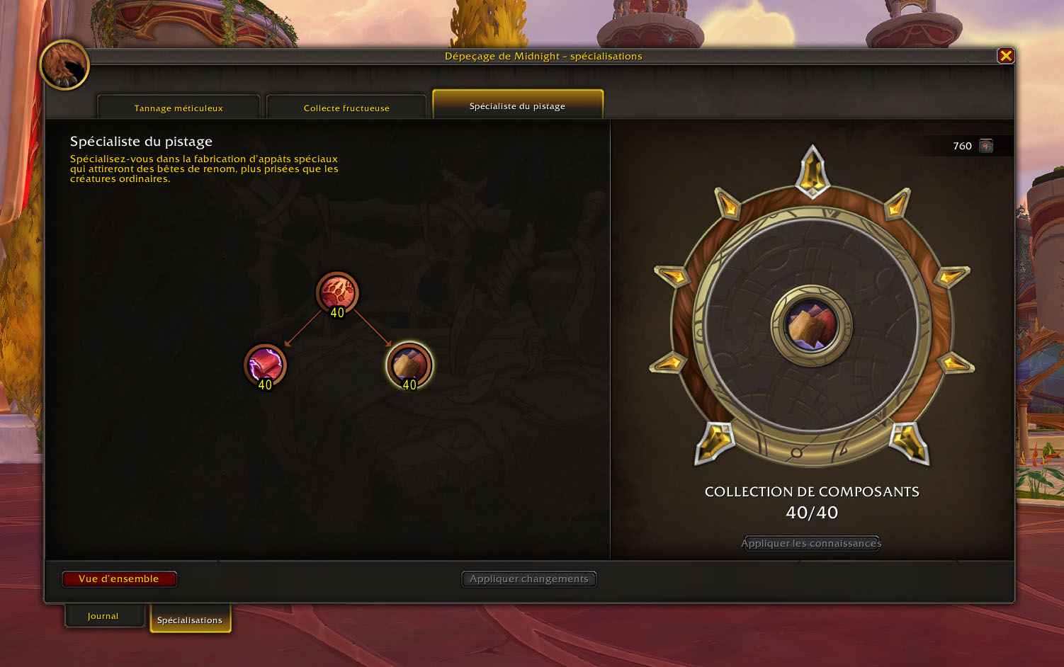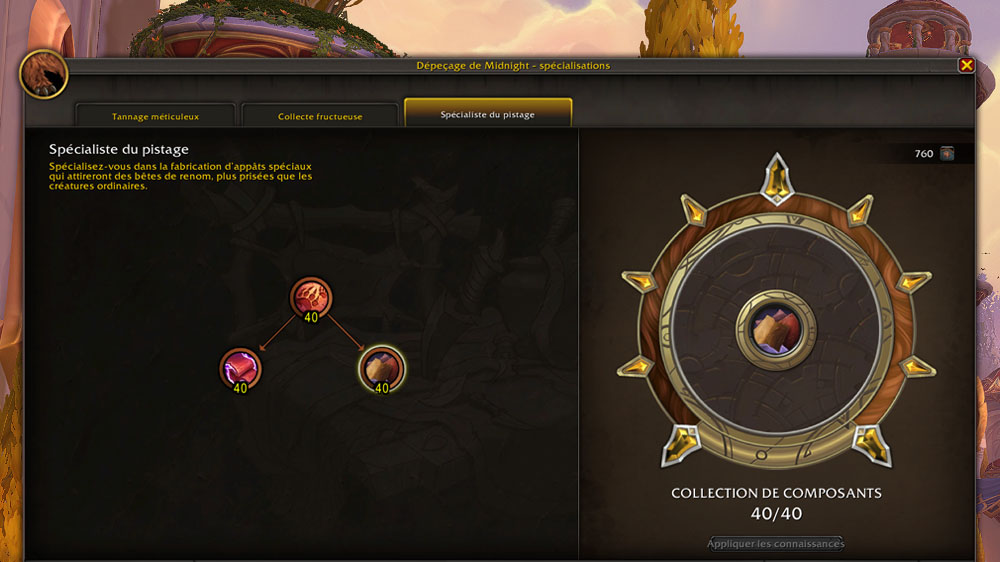Le build de départ est désormais terminé et représente un total de 120 points de connaissance. Vous pouvez ensuite débloquer la spécialisation Spécialiste du pistage, qui permet de fabriquer des appâts et d’attirer des bêtes de renom. Ces dernières sont susceptibles de vous fournir des composants majestueux, essentiels à d’autres métiers.