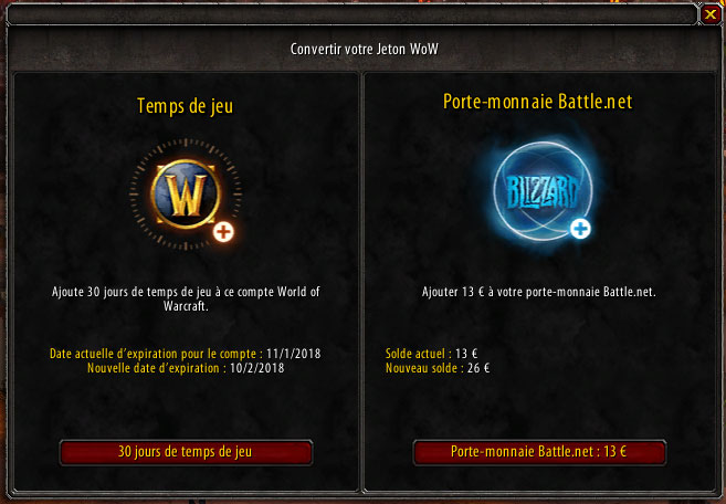Dorénavant quand vous achetez un jeton contre des Po vous avez le choix: soit ajouter 30 jours de jeu ou transformer ce jeton en 13€ sur votre compte Battle.net. Vous pouvez ensuite dépenser cet argent comme bon vous semble (enfin presque).
