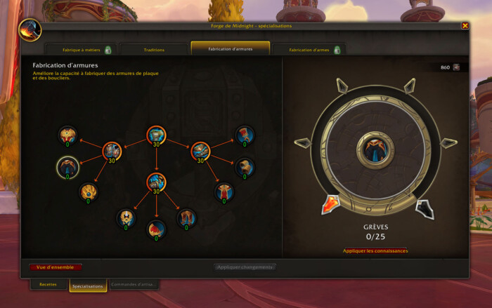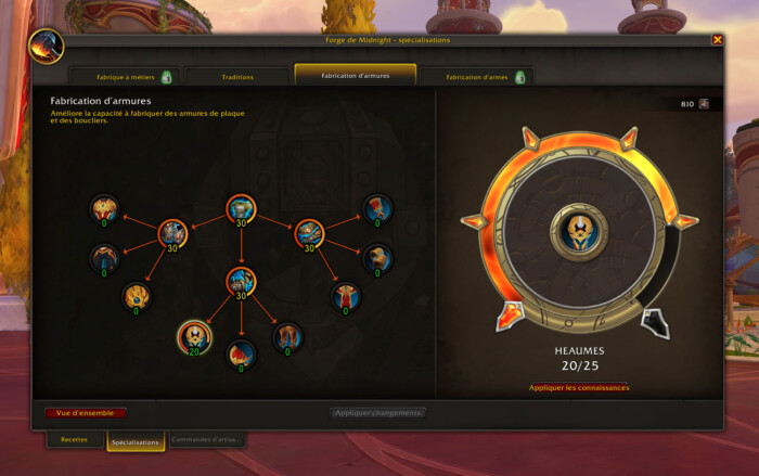 Maintenant que nous avons gagné 8 % d’ingéniosité, nous pouvons débloquer nos premières recettes. Direction la spécialisation Fabrication d’armures.