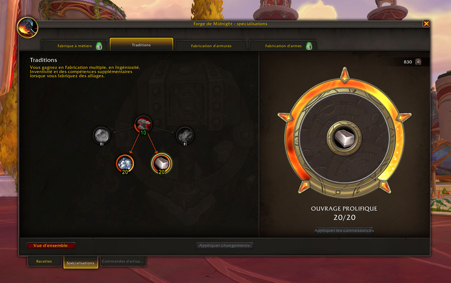 Le build de départ est désormais terminé et représente un total de 140 points de connaissance. Pour aller plus loin, vous pouvez améliorer votre fabrication multiple lors de la fonte de lingots et d’alliages. Dans un second temps, vous pouvez également vous spécialiser dans une ou plusieurs pièces d’équipement. Comptez 20 points de connaissance par pièce, ou 25 si vous souhaitez débloquer le bonus de réparation associé.