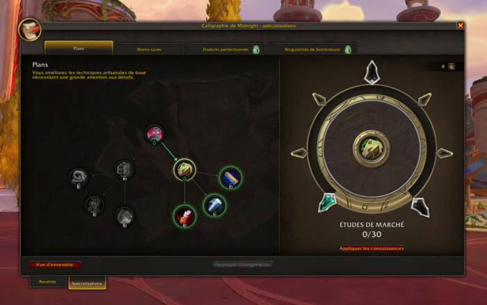 Si vous préférez éviter de vous retrouver avec 50 traités thalassiens en trop, il existe une alternative basée sur les outils de métier rares. Via la spécialisation Plans, vous pouvez débloquer la Plume sin’dorei sans dépenser de point de connaissance (en déverrouillant le premier nœud, puis Études de marché).