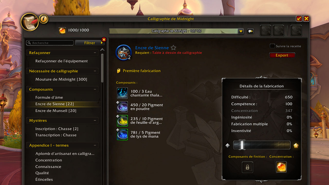 Tout comme à Dragonflight et The War Within, les calligraphes disposent d’une interface de mouture. Cette dernière se fait par lot de 10 plantes de Midnight :