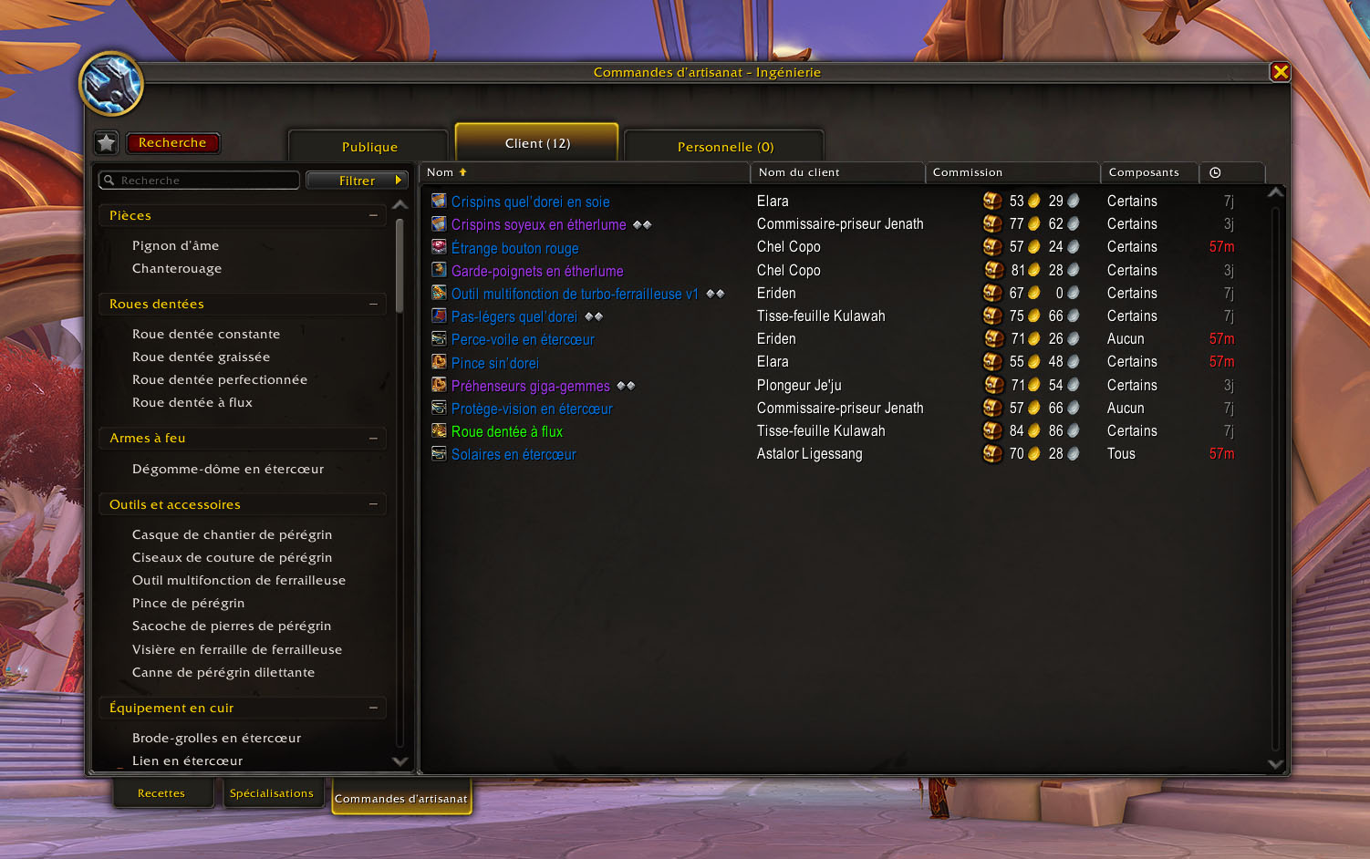 De manière générale, vous pouvez monter du niveau 1 à 60 simplement en passant par les maîtres de profession. En revanche, la progression de 60 à 100 repose en partie sur les commandes d’artisanat. Depuis The War Within, les commandes d’artisanat des clients (PNJ) facilitent justement cette tranche 60 à 100.