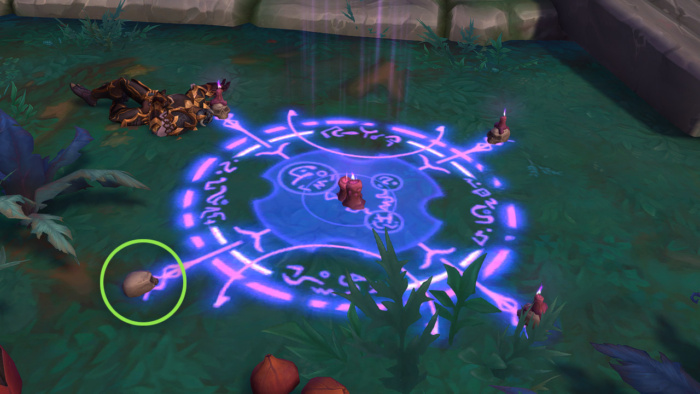 50.68, 47.34 pour trouver le cercle rituel. Celui-ci est incomplet : quatre crânes sont disposés autour, et l’un d’eux ne possède pas de bougie. Récupérez-la sous l’arbre à proximité, puis placez-la sur le crâne.