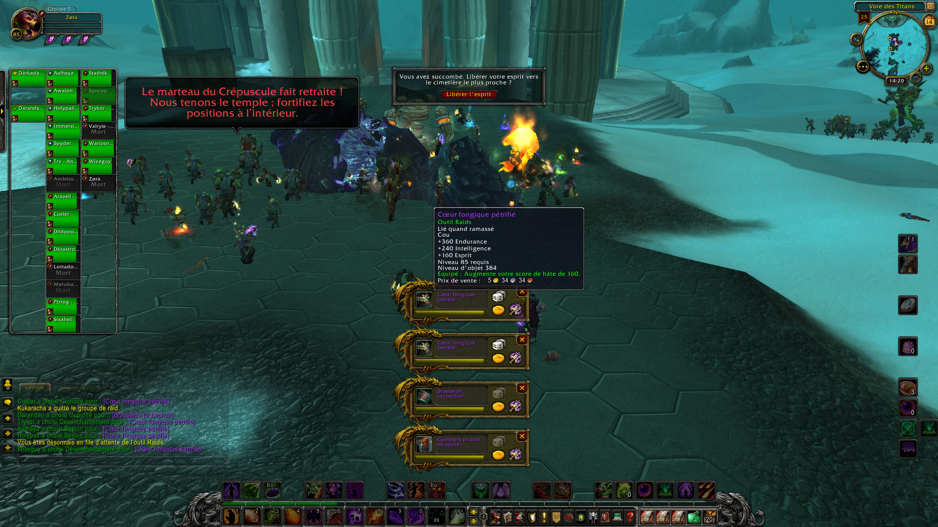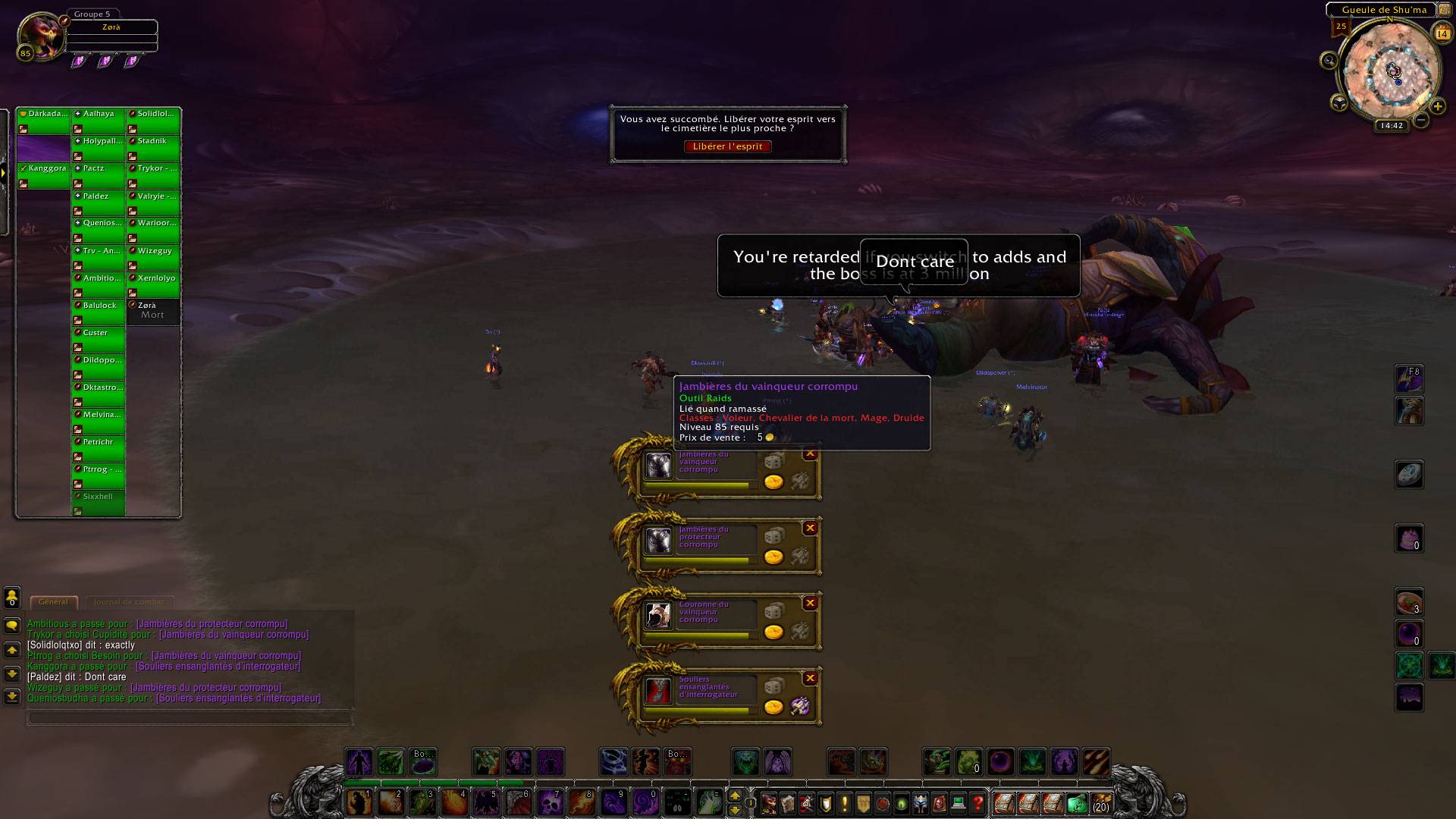 Bon là c’est le drame, un add pop, le raid se fait exploser, une quinzaine de personne décident de sauvagement quitter le groupe de raid. J’ai décidé d’arrêter l’aventure aussi à ce moment, repartant les mains vides avec un équipement à réparer.
