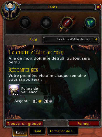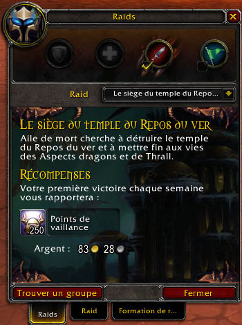 La recherche de raid se veut aussi simple que la recherche de donjons aléatoire. On ouvre une nouvelle fenêtre (Ctrl+i) dédié à la recherche de raid, on choisis son rôle et on attends que le groupe se forme. La recherche ne fonctionne pour le moment qu’avec l’Âme du Dragon qui a pour l’occasion été divisé en deux parties distinct (2 x 4 boss). Une fois le raid terminé, vous recevez 250 points de Vaillance dans la limite de 2 raids par semaine (soit 500 points).