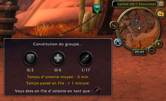 Une fois inscrit, une infobulle apparait en haut de l’écran, en passant sa souris dessus, on peut voir que les groupes sont formés de 2 tanks, 6 heals et 17 DPS. Le temps d’attente n’est vraiment pas significatif puisque je suis sur les Royaumes de Test et donc qu’il y a peu de serveurs et une forte concentration de joueurs à cette heure là (ndlr: 20h30). Je crains que cela soit vraiment plus long sur nos serveurs même si les raids seront inter-serveurs.