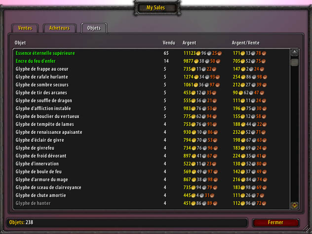 Comme vous pouvez le voir, ce qui a bien boosté mes ventes cette semaines sont les essences éternelles supérieures grâce à la première astuce que j’ai publié sur le blog et qui fonctionne toujours aussi bien. C’est quasiment du 100% bénef, les composants ne me coutant que quelques Po. Les encres occupent quant à elle la seconde place comme souvent. Mise à part ça, j’ai vendu des glyphes, je fonce tête baissée vers le million et c’est la valeur la plus sûr actuellement à l’HV.
