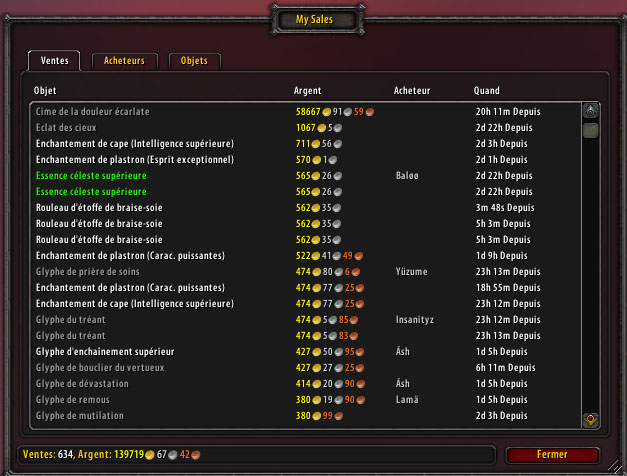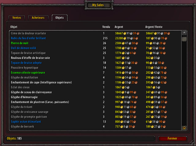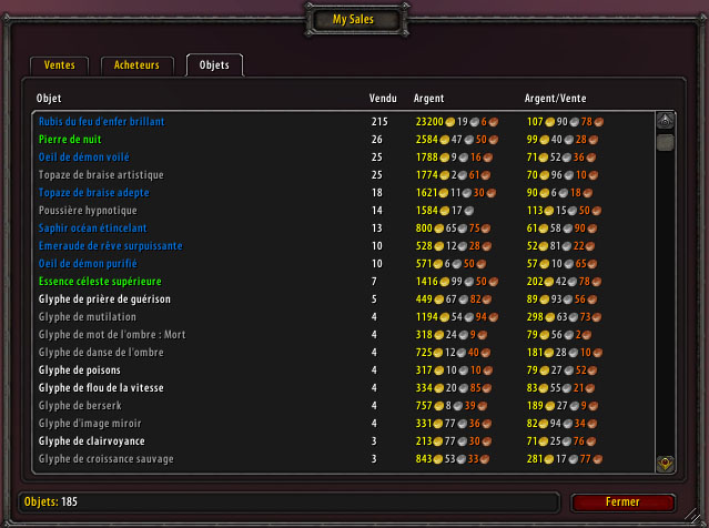 Le chiffre clé de cette derniers jours est donc 139 719 Po . Cependant il est à nuancer, concernant la Cime de la douleur écarlate, j’ai fait de l’achat / revente. Il faut déduire les 45 000 Po que j’ai investis dedans.  Nous arrivons donc à 94 720 Po de ventes. Pour tout vous avouer j’ai pas mal galéré au début pour vendre mes glyphes, au final j’en ai vendu beaucoup mais en petite quantité, les prix étant assez stables, cela n’a pas joué négativement sur mes bénéfices. Là où ça a réellement explosé c’est du côté des gemmes, j’ai écoulé pas moins de 215 Rubis du feu d’enfer brillants. J’ai par ailleurs vendu quelques enchantements. Le tout représente 634 ventes en 4 jours. Si on remet ça au jour, cela nous fait donc environ 158 ventes et 23 680 Po par jour.