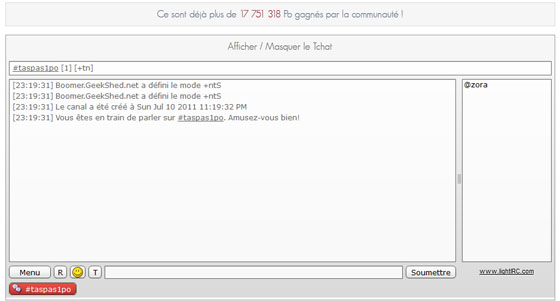 Après avoir passé toute la journée avec Guizmus à fignoler les derniers réglages le T’chat est de nouveau disponible ! Grande nouveauté, celui-ci s’axe sur un salon de discussion unique mais aux fonctionnalités nombreuses. En effet celui-ci est basé sur le protocole IRC, conçu il y à plus de 20 ans. Les habitués ne seront pas dépaysés, vous pouvez utiliser le client de votre choix pour vous y connecter via irc.lightirc.com, canal #taspas1po