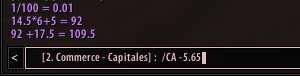 Cas de figure, une personne vend 22 piles de plantes pour 13 Po sur le canal commerce, hop un coup de ConsoleCalc, ça nous donne 260 plantes, soit 60 Pa la plante. Vous auriez pu faire un Alt-Tab sous Windows mais ce sont de précieuses secondes qui peuvent vous faire perdre un achat ou une vente.