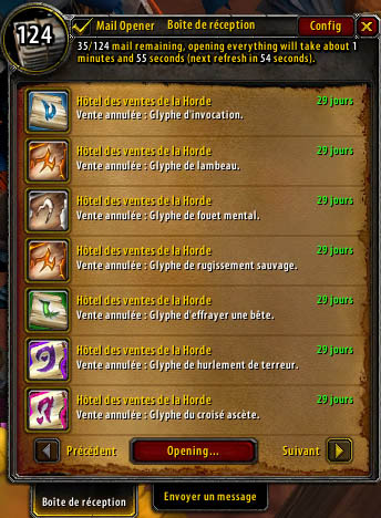 [box type= »info »]Blizzard limite l’ouverture du courrier à 50 lettres par minute. Aucun add-on ne permet d’outre-passer cette limite. Il faut malheureusement faire avec.[/box]