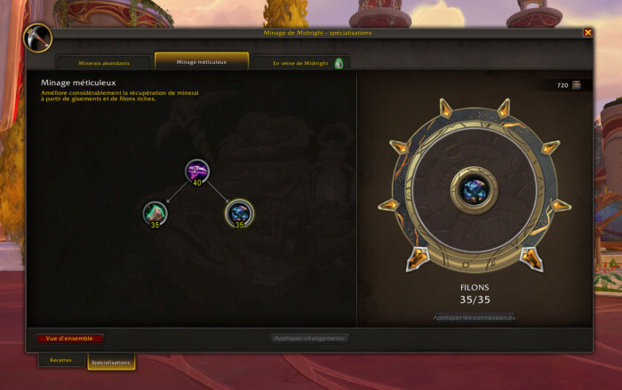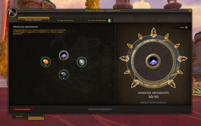 La priorité est de débloquer la récolte de minerai à dos de monture. Ce bonus indispensable vous fera gagner énormément de temps. Commencez par remplir l’anneau Minage méticuleux de la spécialisation éponyme.
