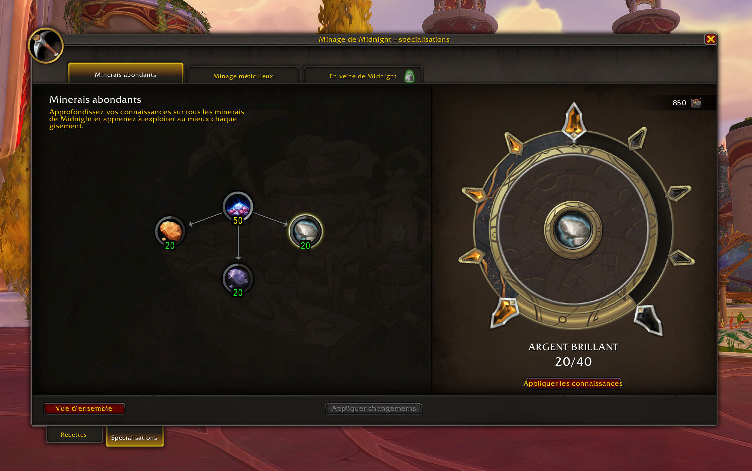 La priorité est de débloquer la récolte de minerai à dos de monture. Ce bonus indispensable vous fera gagner énormément de temps. Commencez par remplir l’anneau Minage méticuleux de la spécialisation éponyme.