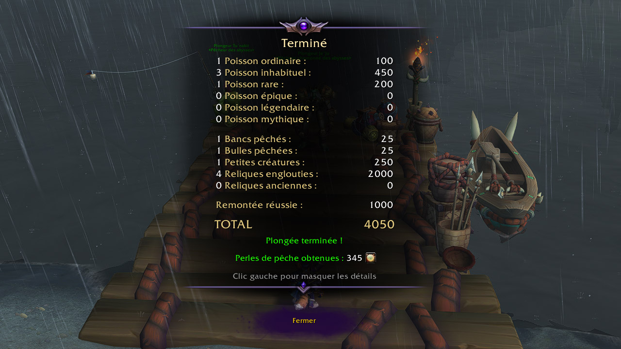 Chaque poisson capturé, qu’il soit ordinaire, inhabituel, rare, épique, légendaire ou mythique, ainsi que les reliques, petites créatures et bulles récoltées, vous rapporte un certain nombre de points. Plus votre score est élevé, plus vous recevrez de