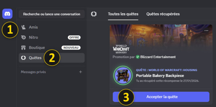 Cliquez sur Accepter la quête 3, puis lancez World of Warcraft pendant 15 minutes, en gardant bien Discord ouvert. Une fois le temps écoulé, Discord vous donnera un code à saisir sur Battle.net.
