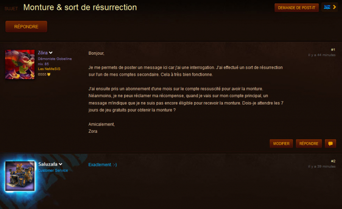 Publié le 8 mars 2012 à 12h48Comme vous le savez, l’émetteur du sort de résurrection peut obtenir une monture. Je m’étonnais hier de ne pas l’avoir et bien ceci est tout à fait normal. Vous pourrez l’obtenir une fois les 7 jours de jeu écoulés (en sus de l’abonnement d’un mois minium). MAJ: comme confirmé par le service et dans les […]