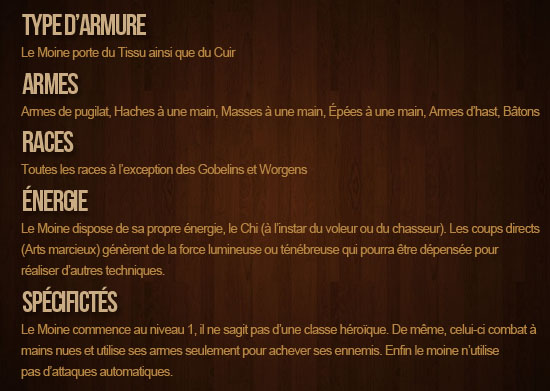 Publié le 22 octobre 2011 à 17h07Les maîtres pandarens ont décidé de partager leur riche expérience des arts martiaux avec de jeunes combattants de l’Alliance comme de la Horde. Grâce à leur maîtrise de leur force intérieure et à la puissance de leur « chi », les moines sont extrêmement efficaces dans chaque rôle : dégâts, défense et soins. Je vous […]