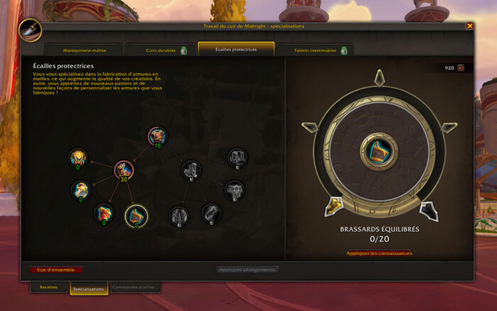 Maintenant que nous avons une base solide grâce à l’ingéniosité, nous pouvons passer au déblocage des recettes. Comme indiqué plus haut, vous pouvez choisir Cuirs durables ou Écailles protectrices. Dans mon exemple, je pars sur la seconde spécialisation.