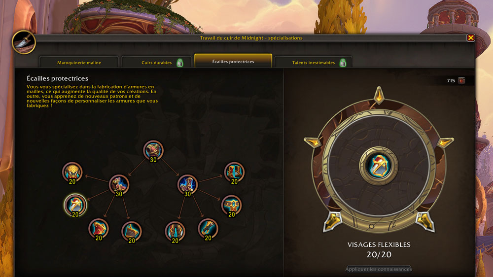 Maintenant que nous avons une base solide grâce à l’ingéniosité, nous pouvons passer au déblocage des recettes. Comme indiqué plus haut, vous pouvez choisir Cuirs durables ou Écailles protectrices. Dans mon exemple, je pars sur la seconde spécialisation.